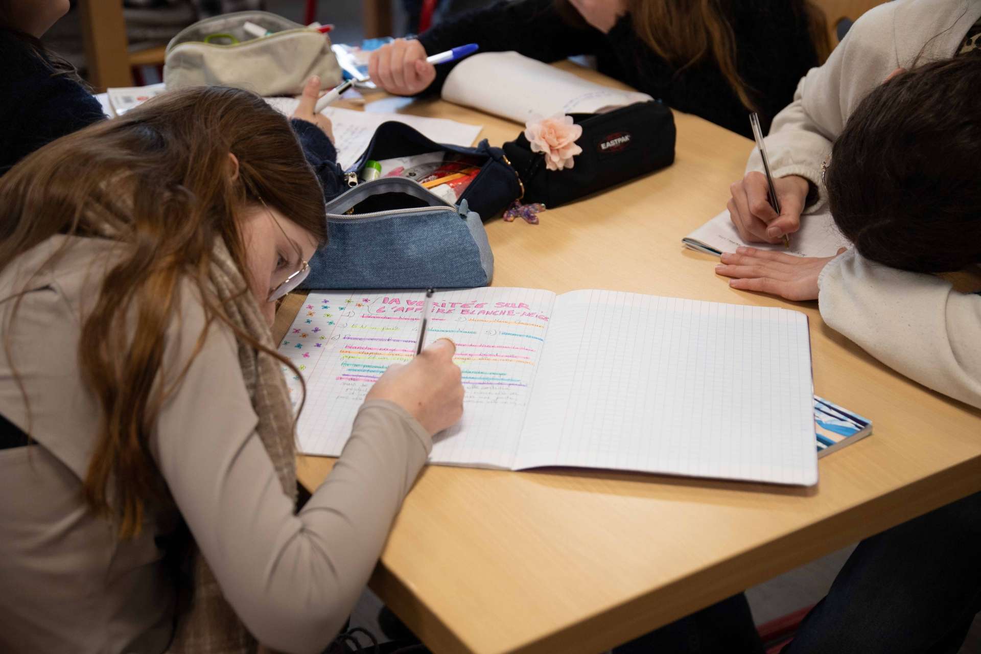 Ainsi, iels se sont enfermé·es au CDI et en salle de musique pendant une semaine et se sont donné·es la mission d'enquêter sur l'affaire Blanche-neige et de révéler sa VRAIE histoire au grand public, sous la forme d’une chanson (ou plutôt, d’un *banger*) en suivant le même procédé de création que le spectacle du collectif. Les élèves ont découpé le conte en sept saynètes, réparties en groupe de trois à quatre, pour un travail de réécriture en petit comité. Ici, tout est permis, et plus encore, le plus fantasque est vivement encouragé !