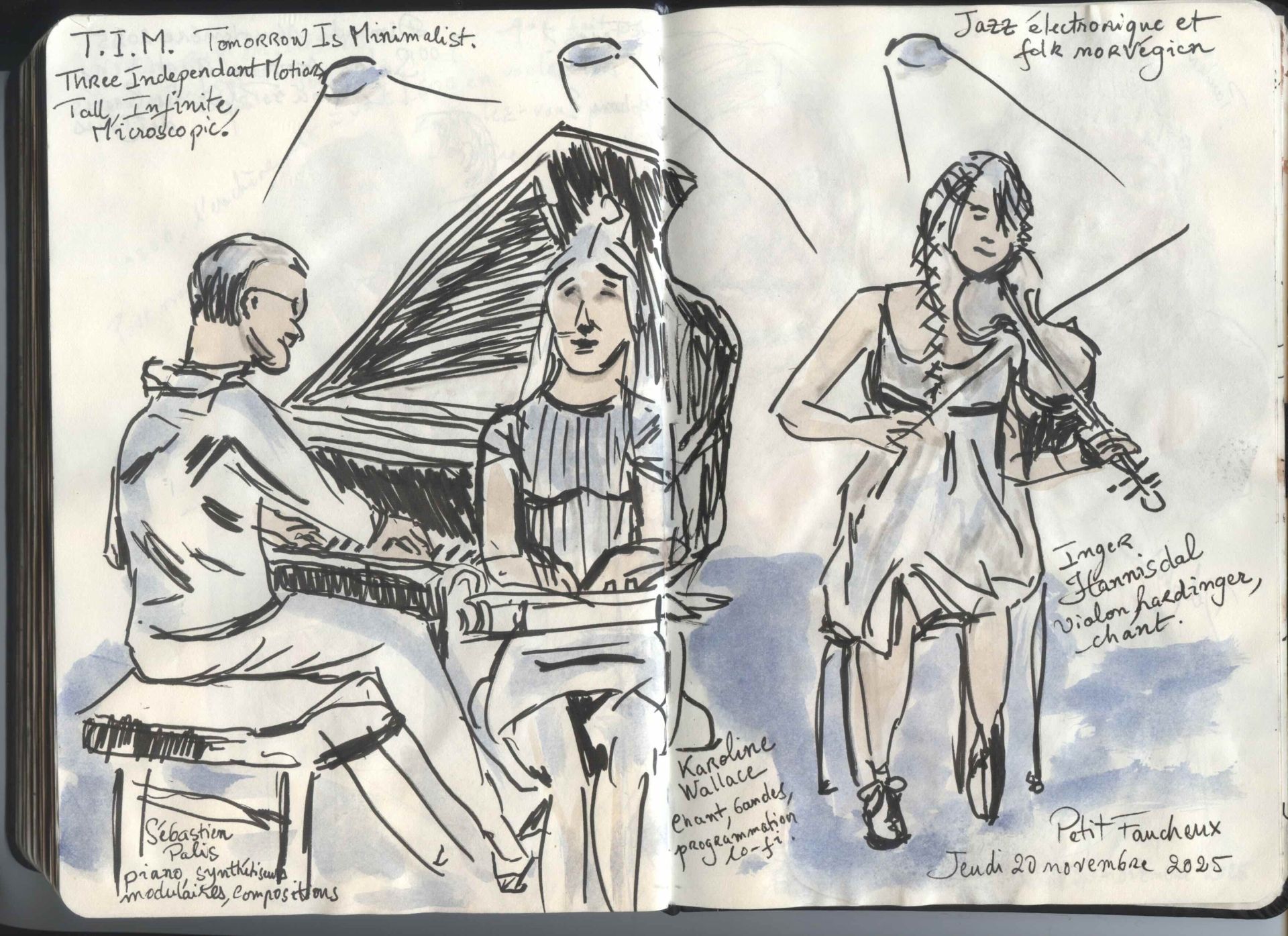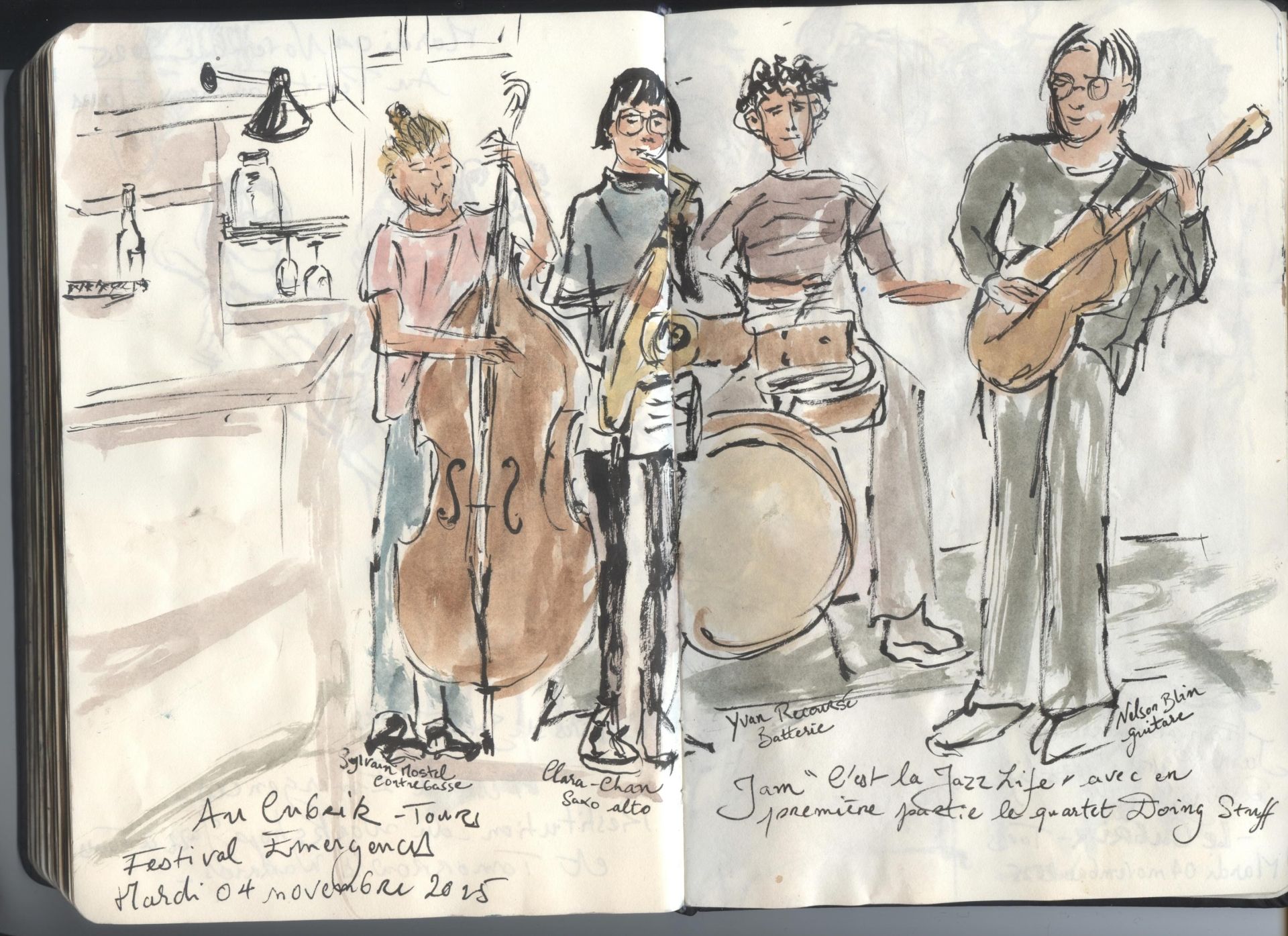 Peu importe le résultat final — ce qui compte, c’est l’instant. Mais aussi la mémoire : J’annote mes dessins du nom des musiciens, de la date et du lieu, pour garder une trace précise de ces instants sensibles.