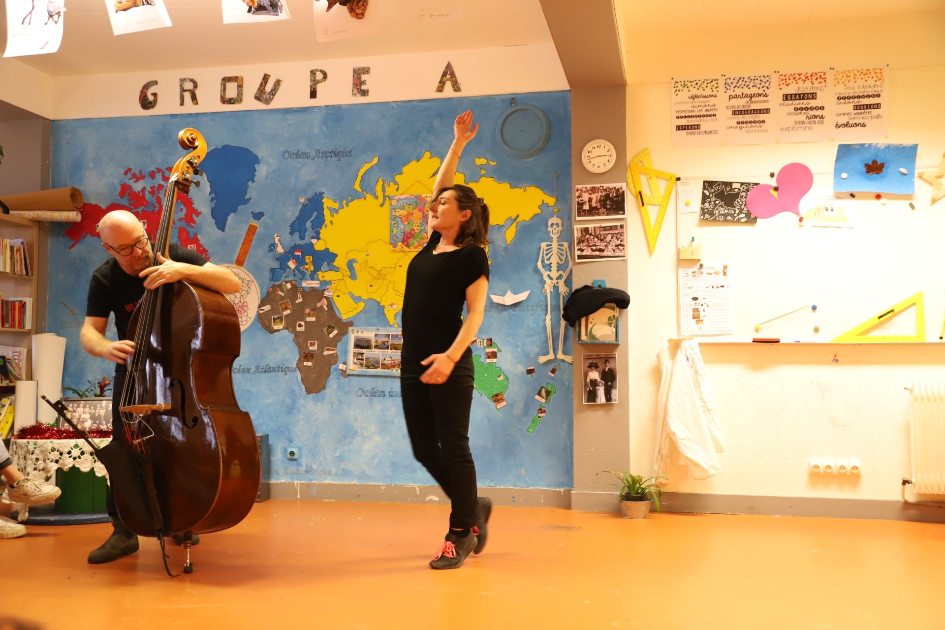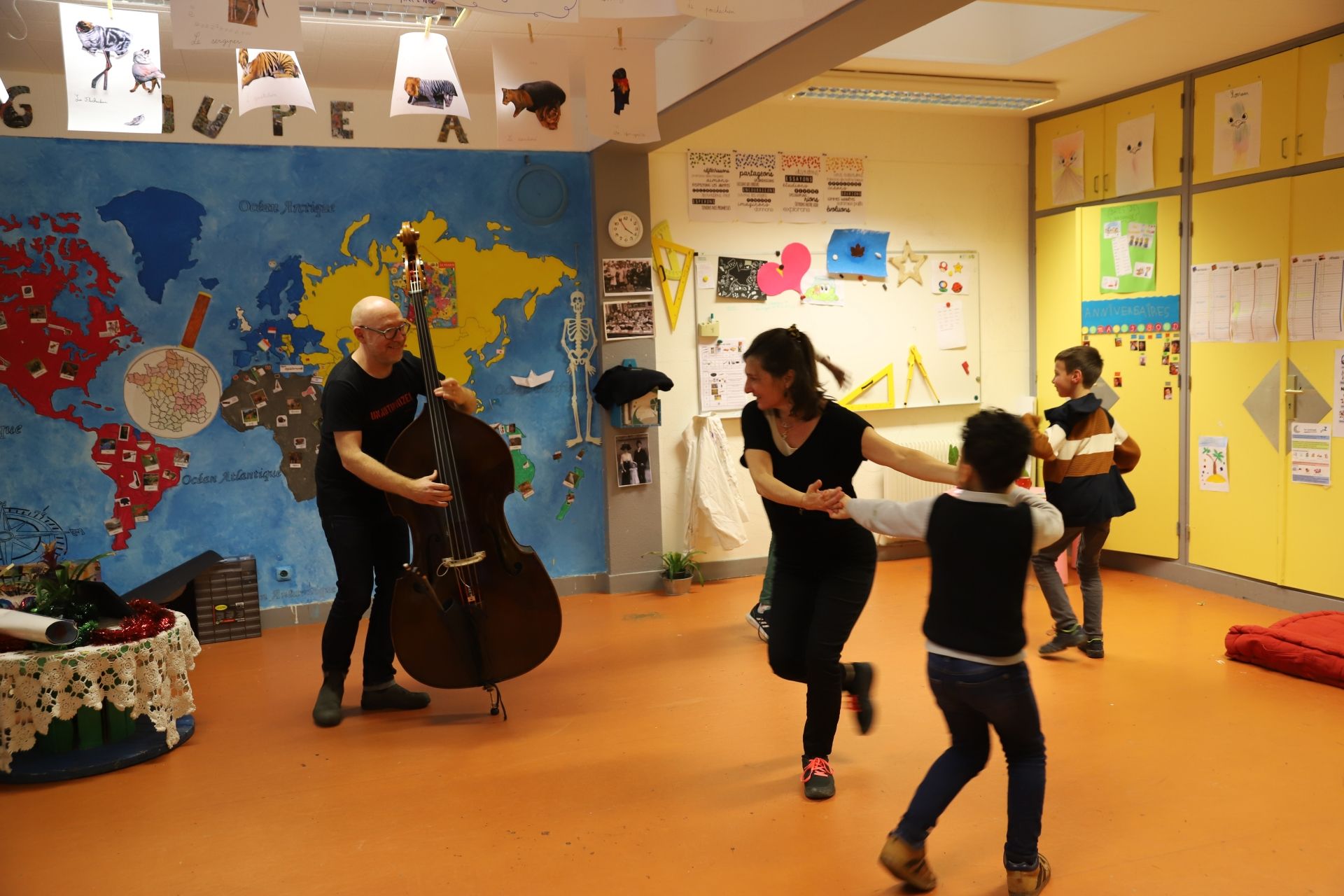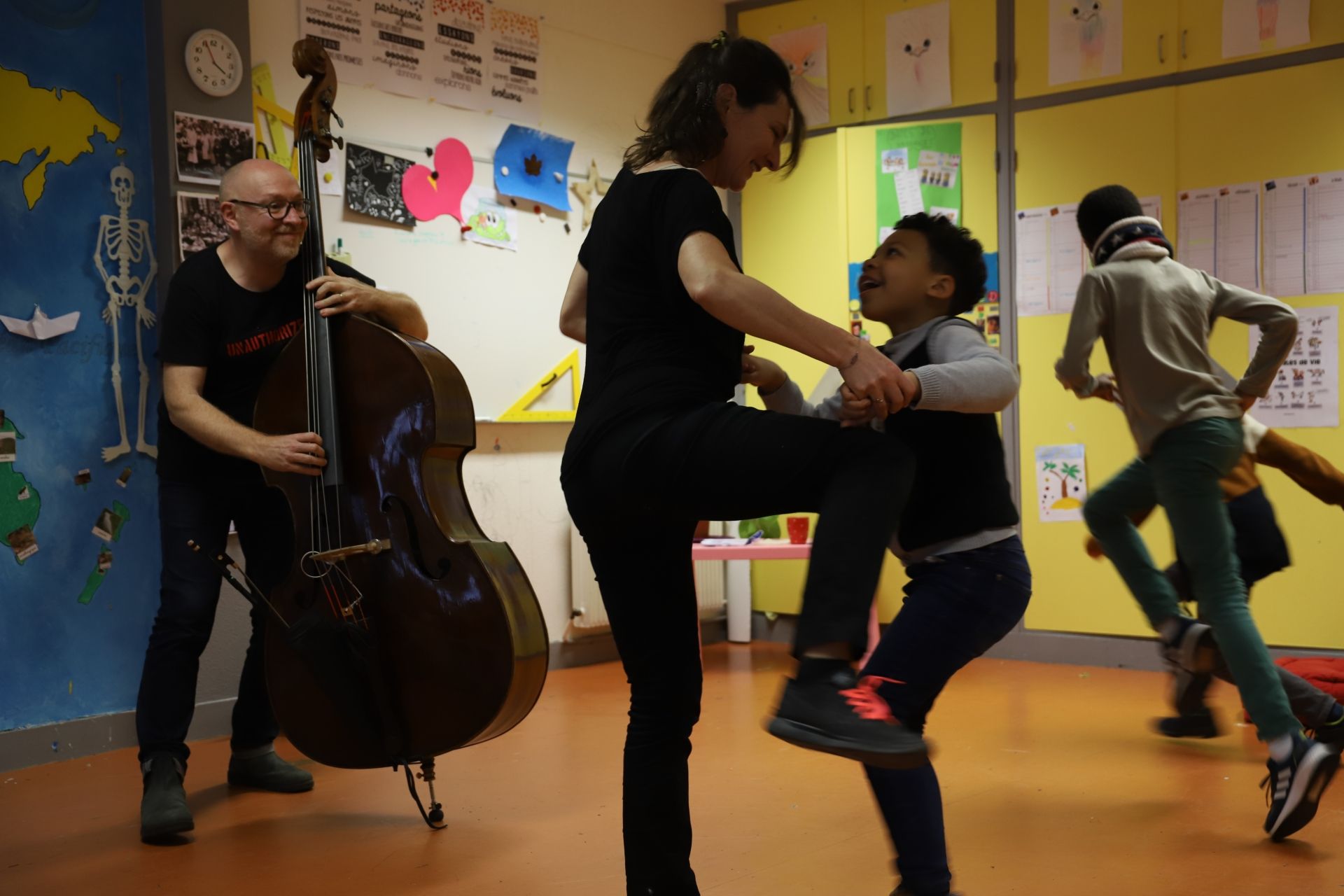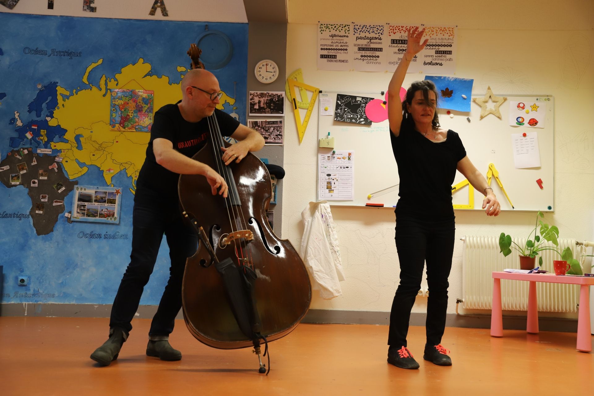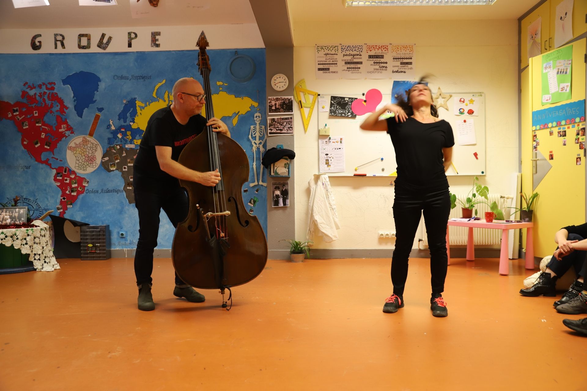 Le mardi 17 janvier 2023, l’Institut Thérapeutique Éducatif et Pédagogique (ITEP) « l’Éveil » de Tours Centre en partenariat avec le Petit faucheux et le Centre Chorégraphique National de Tours (CCNT) a accueilli la proposition artistique « 1 Salon, 2 Gestes » avec le contrebassiste Sébastien Boisseau et la danseuse Véronique Teindas. Ce moment de musique et de danse a été partagé avec les enfants du groupe des petits (entre 7 et 10 ans), des grands (entre 11 et 15 ans) et les Éducateur.ice.s Spécialisé.e.s.