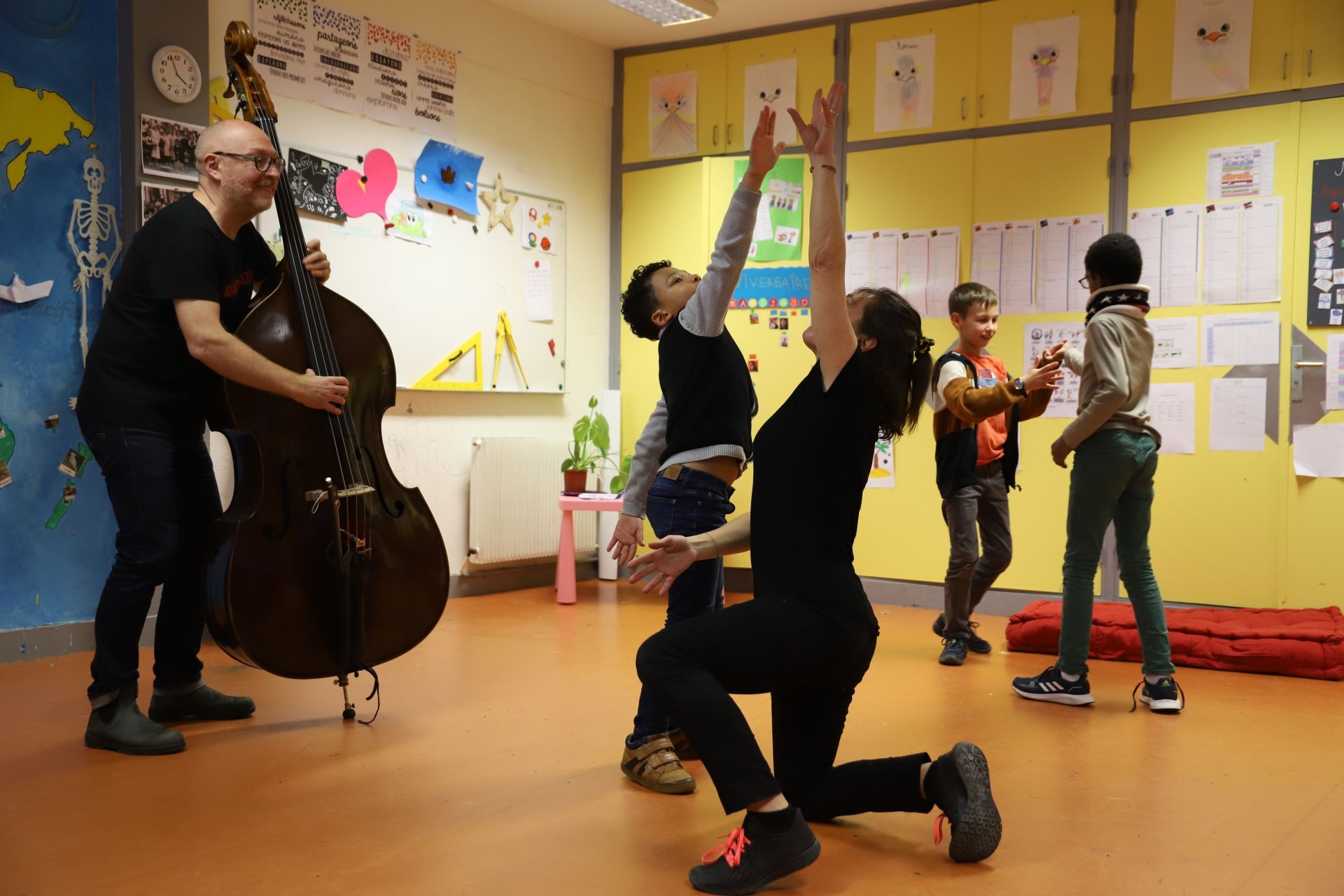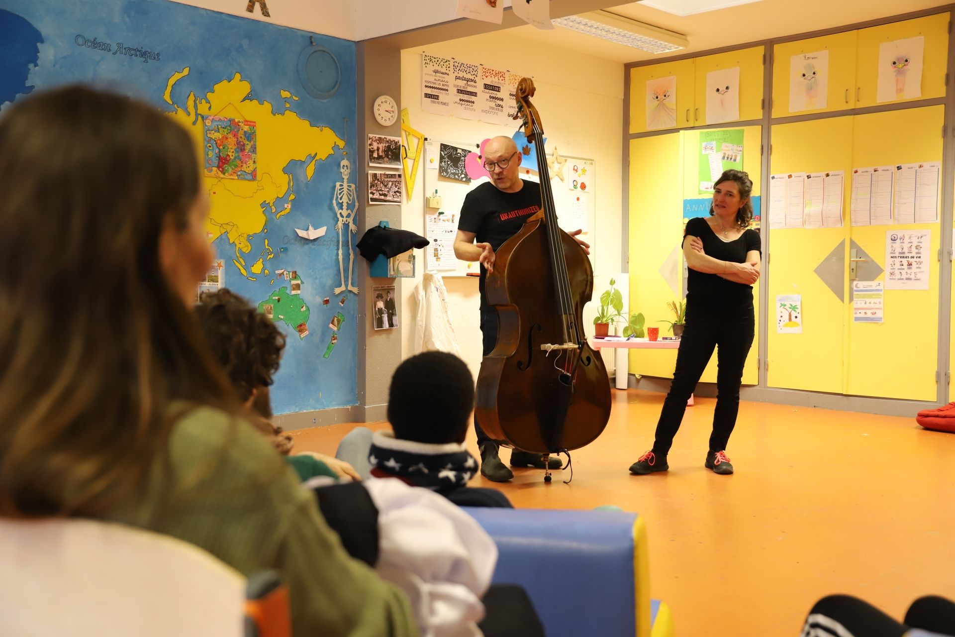 La rencontre du corps et de la musique a suscité chez les enfants des réactions très diversifiées. Allant des rires amusés par l’incompréhension au désintérêt, en passant par les messes basses de la gêne aux commentaires esclaffés, jusqu’au refuge dans les bras d’adultes ou l’évasion hors de la pièce par peur ou colère. Cet inédit du jeu contemporain et expérimental de la contrebasse de Sébastien, lié à la manifestation sous des formes inattendues du corps de Véronique, a été une découverte riche de sensations qui n’a pas laissé indifférent. Une fois l’effervescence de la rencontre estompée, un moment intimiste s’est dessiné et certains se sont même laissés aller à de l’expression corporelle. C’est alors que les corps encore inconnus, se découvrent dans l’espace, le temps d’une suspension. Les ondulations du son enrobent ce moment et les pensées s’échappent dans la jetée d’une main. L’écoute est précieuse, le dialogue est doux et la rencontre s’achève par de béants sourires aux lèvres.